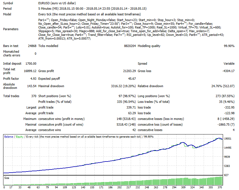 По поводу работы. Изначально и выбирался принцип открытия сделок по цене закрытия бара, что бы легко можно было тестировать и оптимизировать советника, что бы результаты тестов совпадали с результатами реальной торговли. На мой взгляд это удалось. Я делал проверку по сделочно ( дата , время открытия, время закрытия) совпадения сделок в Бек тесте ( 99.9%) и реальной торговле. Совпадение почти полное.
