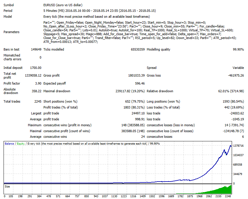 Попробовал погонять по старшим ТФ. Думаю не правильно зацикливаться только на ночном скальпинге и младших ТФ. В общем вот что получилось. EURUSD Н1. Время работы с 1.00 тдо 23.00
