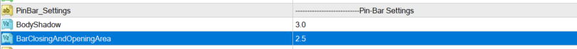 Hello, BodyShadow (filter) is the coefficient obtained if you take the shadow of the bar (hairpin) / on the body of the bar. Example: spire = 50, body = 10, BodyShadow = 3 total (50/10)= 5, if 5 > 3 (Body Shadow) the pin bar passes.BarClosingAndOpeningArea is the coefficient in which part of the entire bar the body of the pin bar will be located. HIGH -((HIGH-LOW)/BarClosingAndOpeningArea) for SELL signal, LOW +((HIGT - LOW)/BarClosingAndOpeningArea) for BUY. Example (sell): if you look at the calculation then 2 is the middle of the bar if 2.5 is just below the middle of the bar. Now if the body is below this value, the pin bar