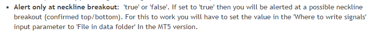 In order to be alerted about neckline breakout you must set the value in the 'Alert only at neckline breakout' input to True.