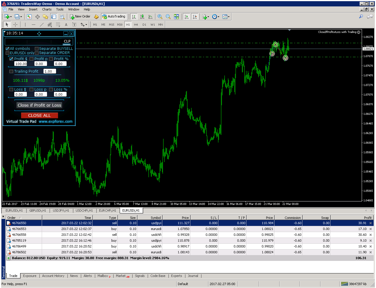 I am trading 5-pairs & wan`t to close open orders when the total open orders are in profit at $100 usd. & close open orders when the total open orders,