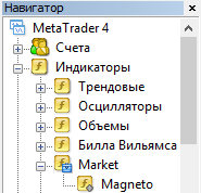 Здравствуйте! Ну если вы уверены что индикатор загрузился в папку терминала, тогда открываете навигатор/Индикаторы/Market. Сам файл должен находиться в папке "c:\Users\Пользователь\AppData\Roaming\MetaQuotes\Terminal\Идентификатор терминала\MQL4\Indicators\Market\magneto.ex4"