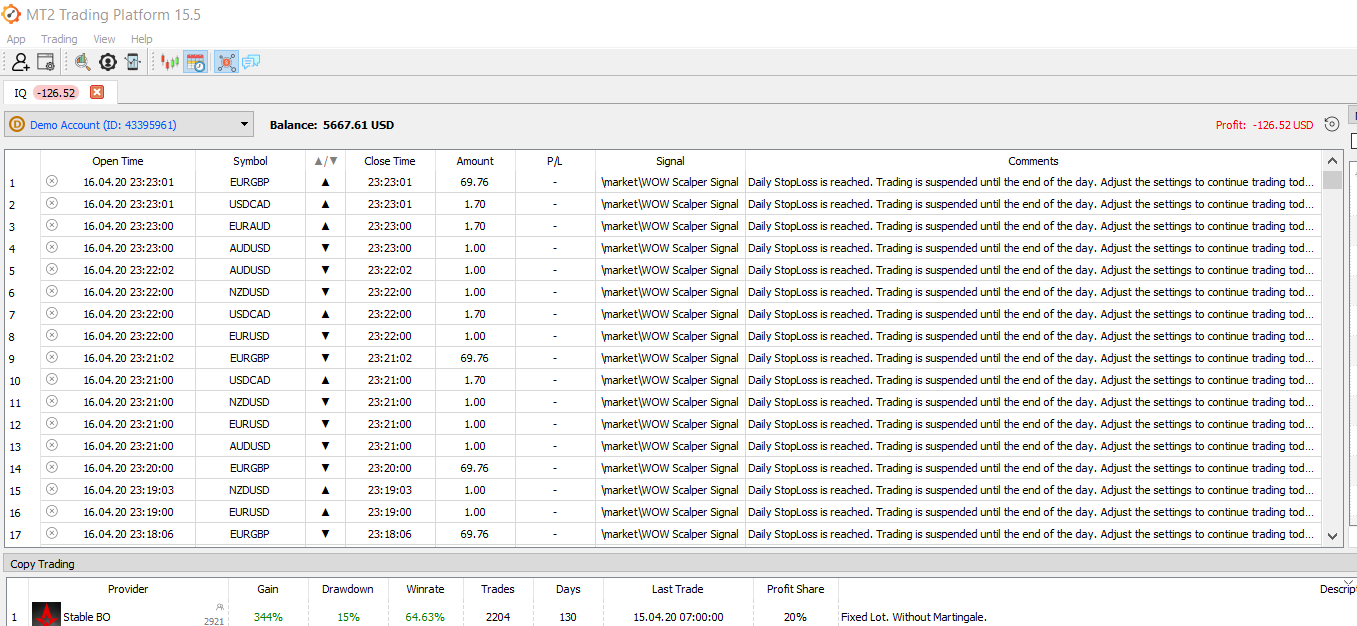 Martingale next expiration or next signal with coef x2.4, x2.5 upto you have fund cover 10steps.