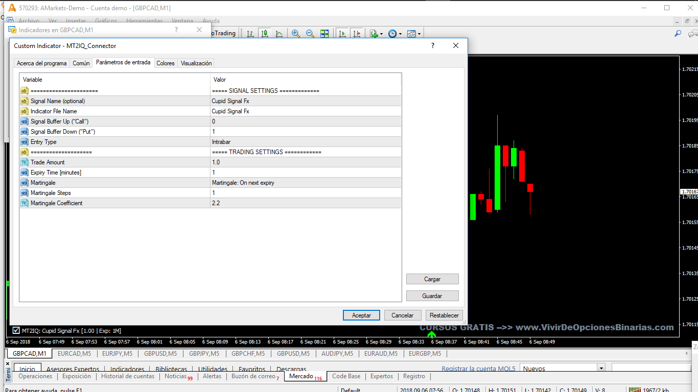 4. The reccomended setting for connector are : Time Frame 1 Minute , Intra Bar , Expiry Time 1 Minute , Martingale for next expiry (reccomend 1 step)