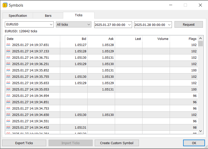 There is nothing in the journal or experts tab that could answer. Always the same message on mt5 "expert tick database loaded successfully" yet when I load mt4, ticks are not showing. I get the notification "To import a tick database from MT5, you msut first run the "tick database" utility in the mt5 terminal" I get this even after resetting mt5 and reloading the tick database. Nothing I have done has fixed this problem consistently, it just seems to be random when it works and when it doesn't