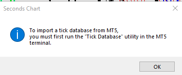 Когда вы запускаете Tick Database, он сначала начинает запрашивать тиковые данные для всех символов из этого окна. Если в этом окне много символов, то на это уходит много времени. Например, для трёх символов достаточно 30 секунд. Если символов много, то может понадобиться 2-5 минут, или больше. Загружается глубокая тиковая история, чтобы её можно было передавать в MT4. Когда вы получаете диалоговое окно с предупреждением "Нужно запустить Tick Database" — это значит, тиковые данные ещё не загружены, нечего передавать в MT4. Seconds Chart запрашивает тиковые данные, а эти данные ещё не подготовлены.