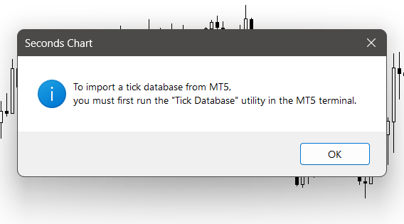 Если вы в терминале MT4 получили диалоговое окно "Нужно запустить Tick Database", можно ещё раз перезапустить Tick Database и подождать пару минут перед запуском Seconds Chart.