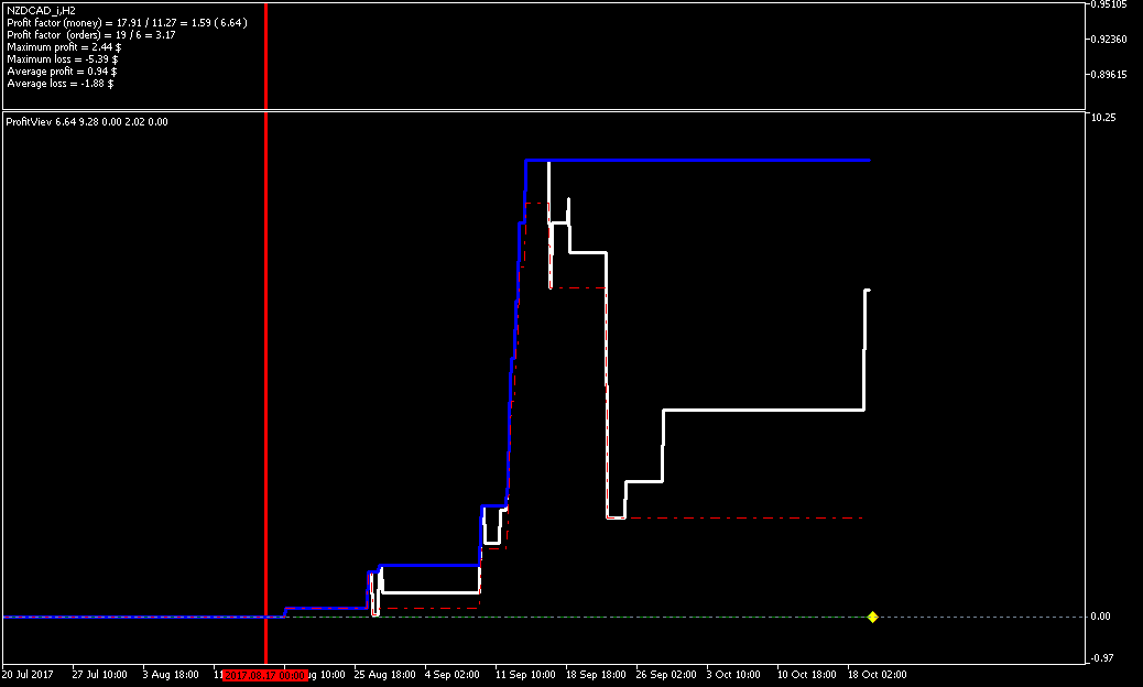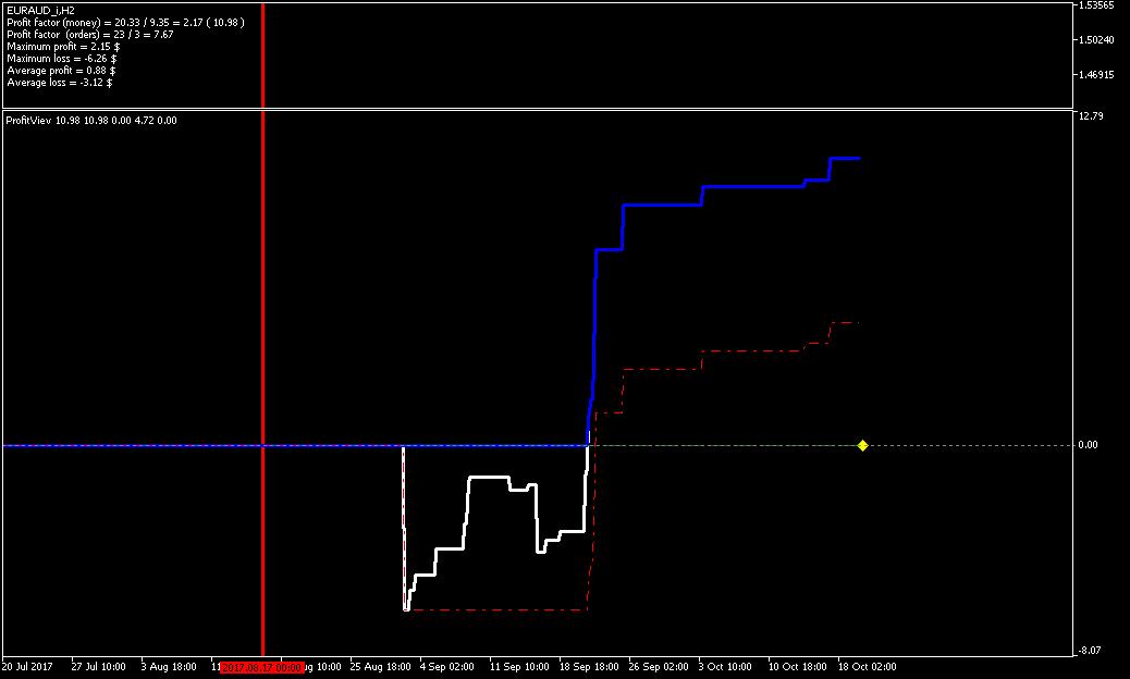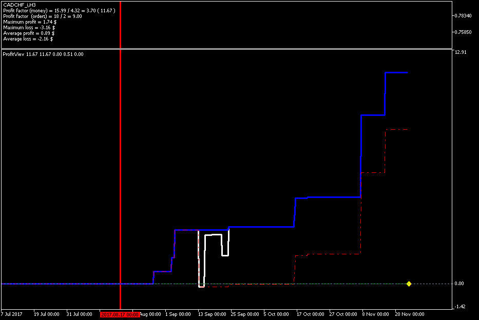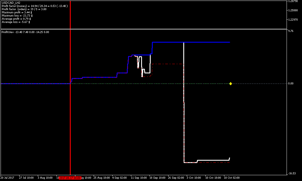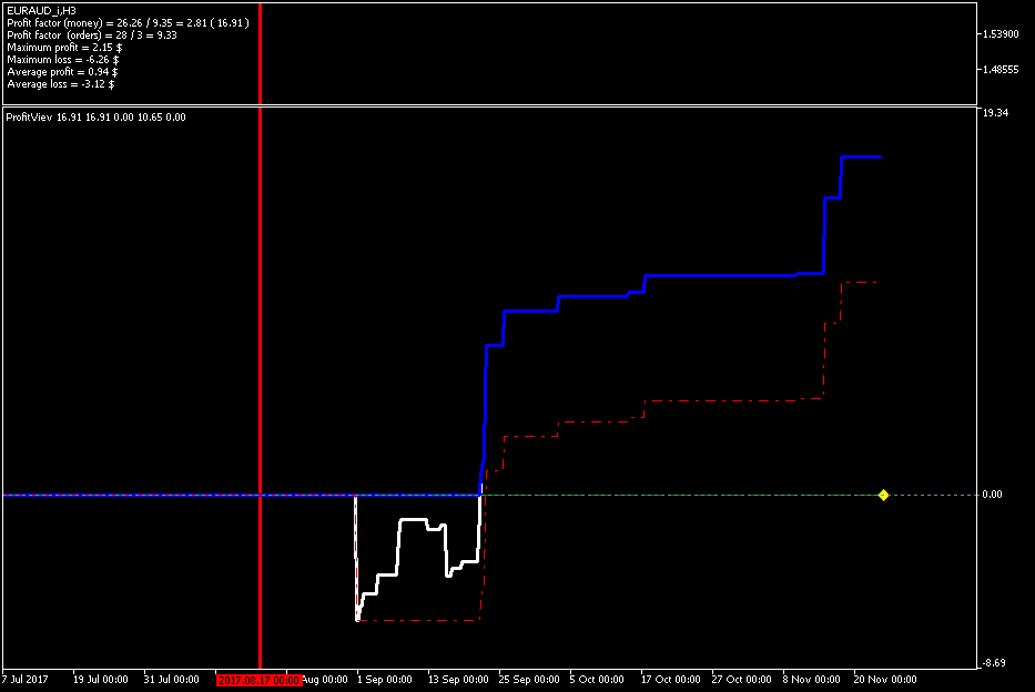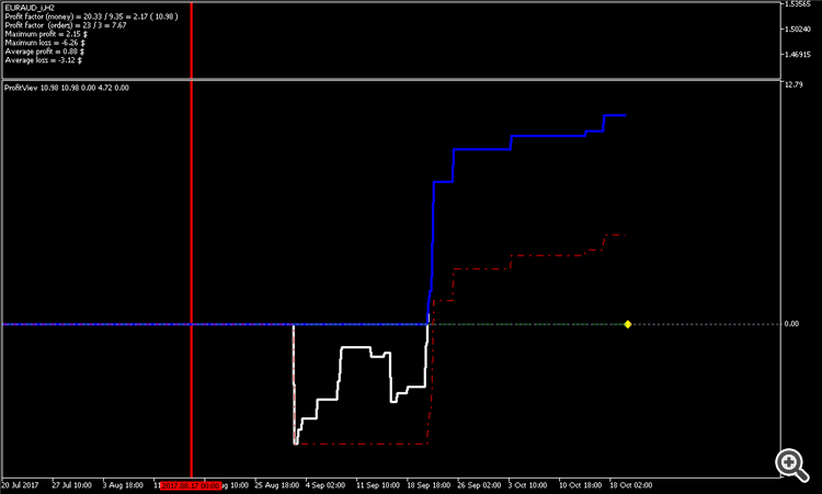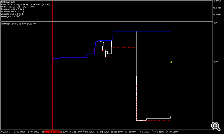 Добрый день, Дамы и Господа. результаты тестирования советника по данному индикатору на памм счете в реальном времени с периода последних изменений в советнике 2017.08.16 23:00 сроком 1 месяц показали следующие результаты, работа производилась на 28 инструментах форекс. так как в терминале не возможно создать отчет по конкретному инструменту за выбранный период времени торговли, привожу скрины с терминала с индикатором показывающим изменение прибыли при закрытии сделки (белая линия), максимальная прибыль (синяя линия), максимальная просадка (красная пунктирная линия). работал советник лотом 0.01 по каждому сигналу, без сопровождения сделок (в рынке по каждому инструменту всегда только 1 ордер), вход и выход по сигналу индикатора. все инструменты оптимизировались на одном интервале времени, с одинаковыми настройками для оптимизации.