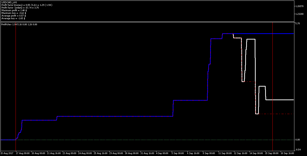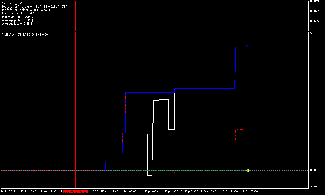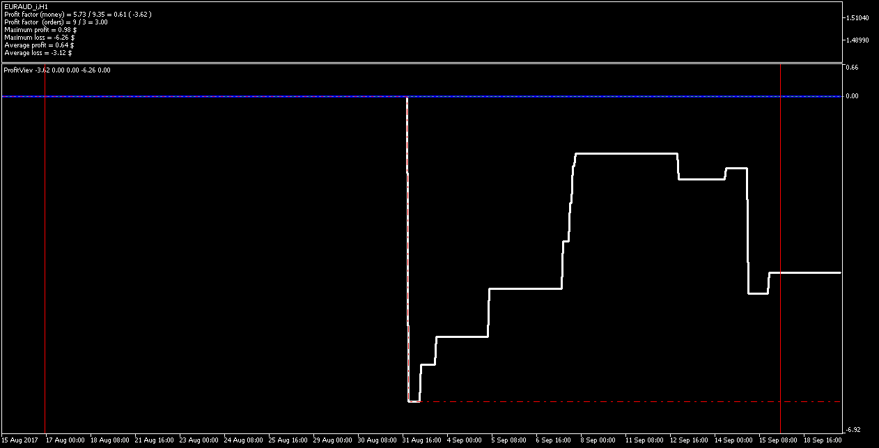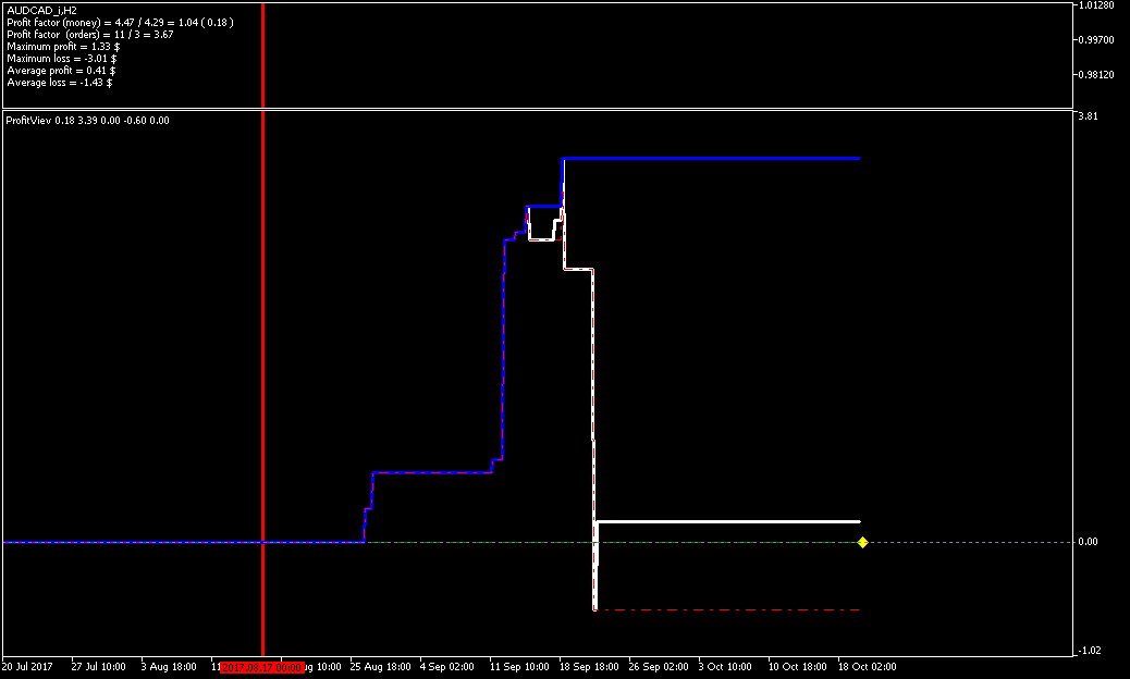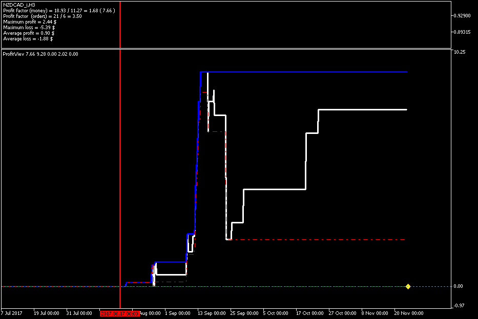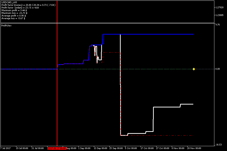 Добрый день, Дамы и Господа. результаты тестирования советника по данному индикатору на памм счете в реальном времени с периода последних изменений в советнике 2017.08.16 23:00 сроком 1 месяц показали следующие результаты, работа производилась на 28 инструментах форекс. так как в терминале не возможно создать отчет по конкретному инструменту за выбранный период времени торговли, привожу скрины с терминала с индикатором показывающим изменение прибыли при закрытии сделки (белая линия), максимальная прибыль (синяя линия), максимальная просадка (красная пунктирная линия). работал советник лотом 0.01 по каждому сигналу, без сопровождения сделок (в рынке по каждому инструменту всегда только 1 ордер), вход и выход по сигналу индикатора. все инструменты оптимизировались на одном интервале времени, с одинаковыми настройками для оптимизации.
