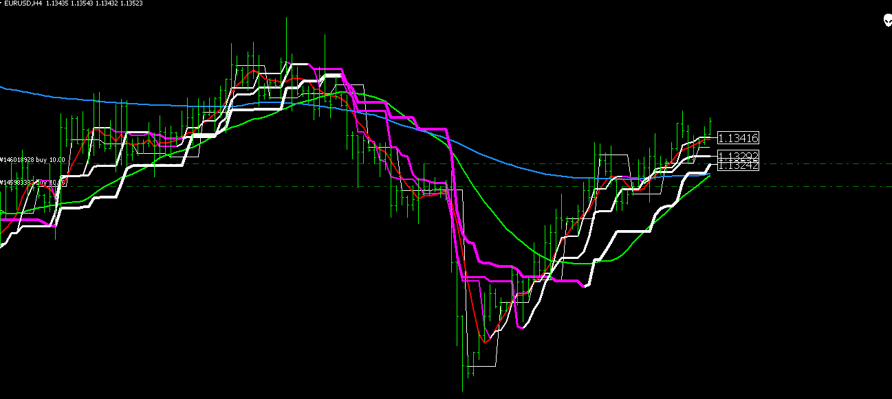 Индикатор отличный! Я уже писал в личку Владимиру про это. Пишу для остальных, я этот индикатор настроил под себя: всё на 4-х часовом графике, ставлю 3 варианта этого индикатора с параметрами:6,12,24 и убираю во всех 3-х индикаторах цвет верхних и нижних каналов, оставляю только середину. Добавляю индикатор urdala_ma и индикатор day open. И очень хорошо видно смену тренда.