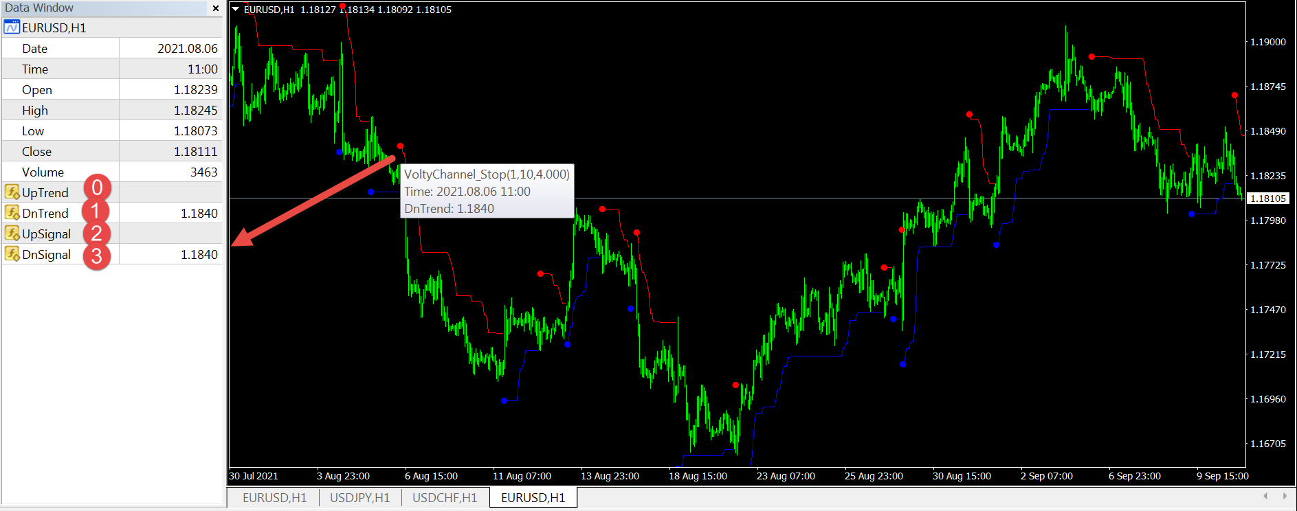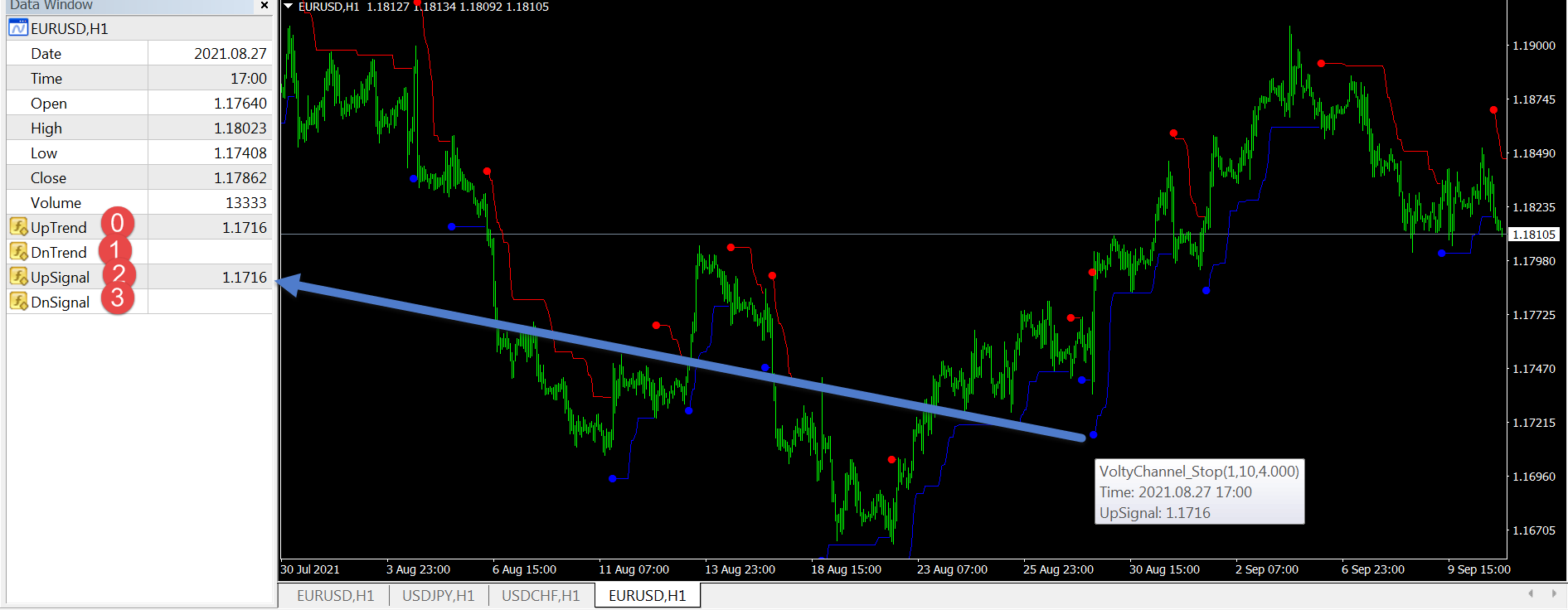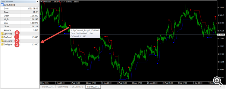 In order to find out the numbers of buffers for signals, we need to load the indicator on the real chart of the terminal: