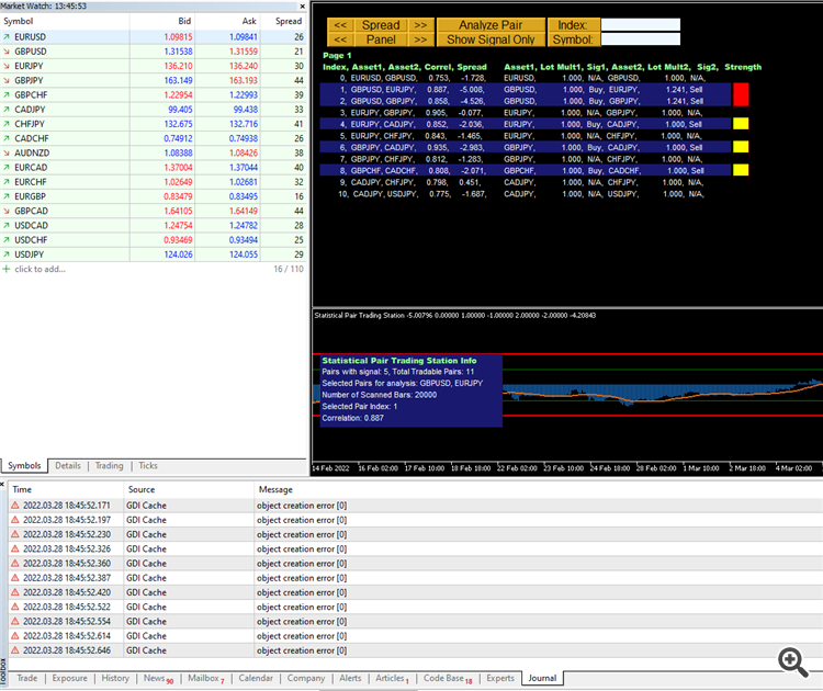 When you click Analyze pair button, indicator will create statistical data base to calculate spread for each pairs.