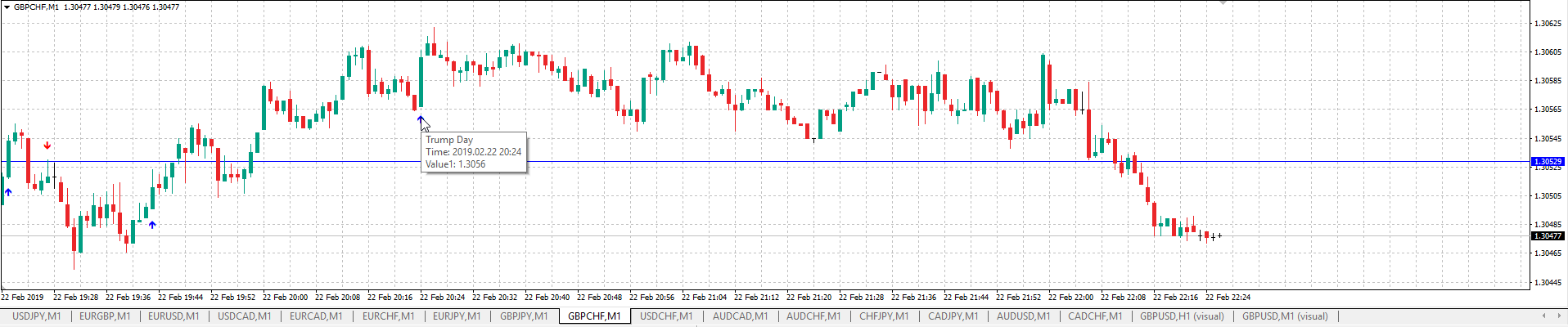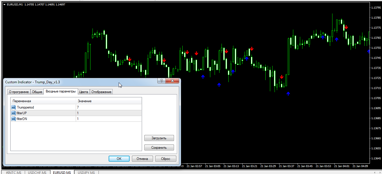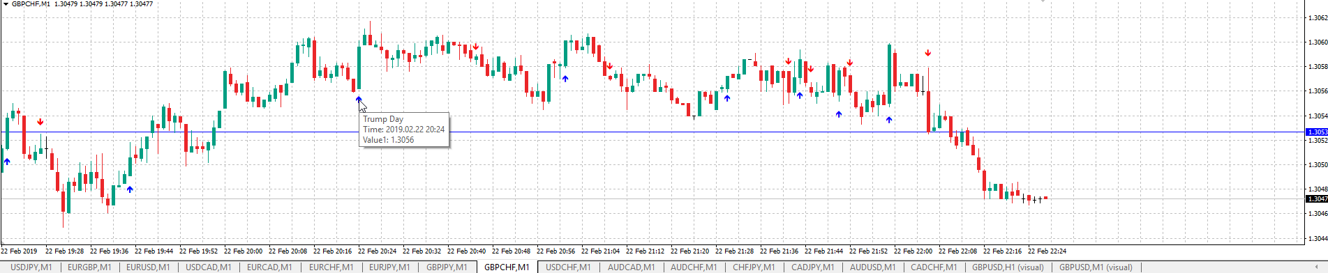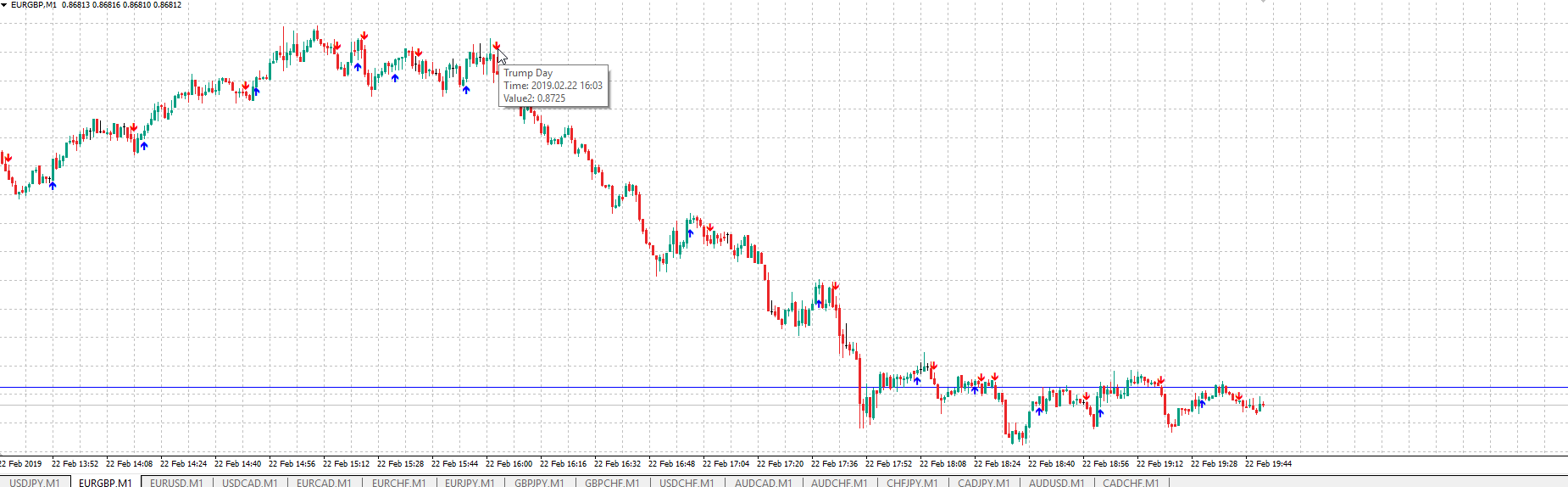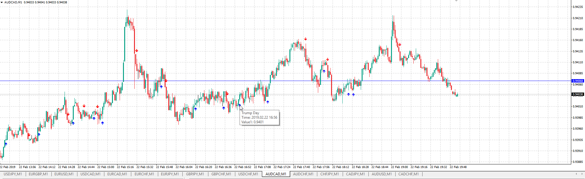 На скринах 4 валюты по 2 скрина для каждой на 1-вом как они выглядят при работе индикатора онлайн (отсутствия стрелок ровно с того момента как индекатор запускается на график ) и 2 скрине появления стрелок если запустить индекатор заново.