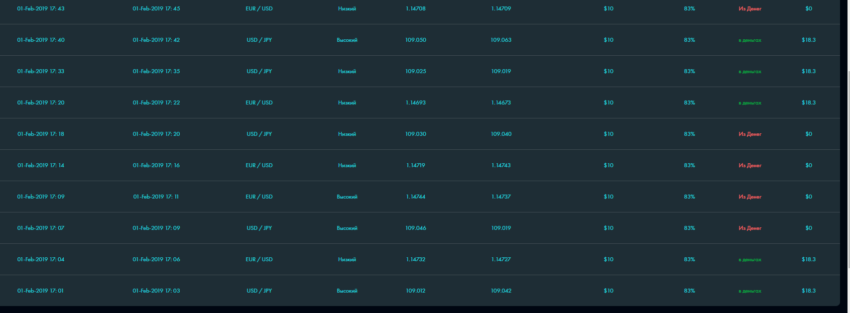 Немного потестировала, в пятницу, индикатор в "Чистом" виде т.е без каких то других сопутствующих на бинарном опционе (демо счет, с реальным там не отличий кроме процента выплат ни в котировках ни в скорости обработки сделки, а проводить такой тест выгодней на демо). Аналогично, конечно, можно было б были придти к выводам и по тестеру стратегий, но подачу сигналов и время сколько у меня уходит от момента подачи до входа в сделку (примерно 10-15 секунд, именно в этом тесте то на результат не повлияла был один раз когда из-за этой разницы в 10- 15 секунд сделка закрылась в - и 1 раз когда в в +), вот что получилось: