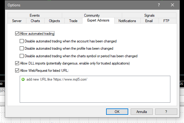 2) Go to menù "Tool > Options > Espert Advisors" and set all, how in the attach photo