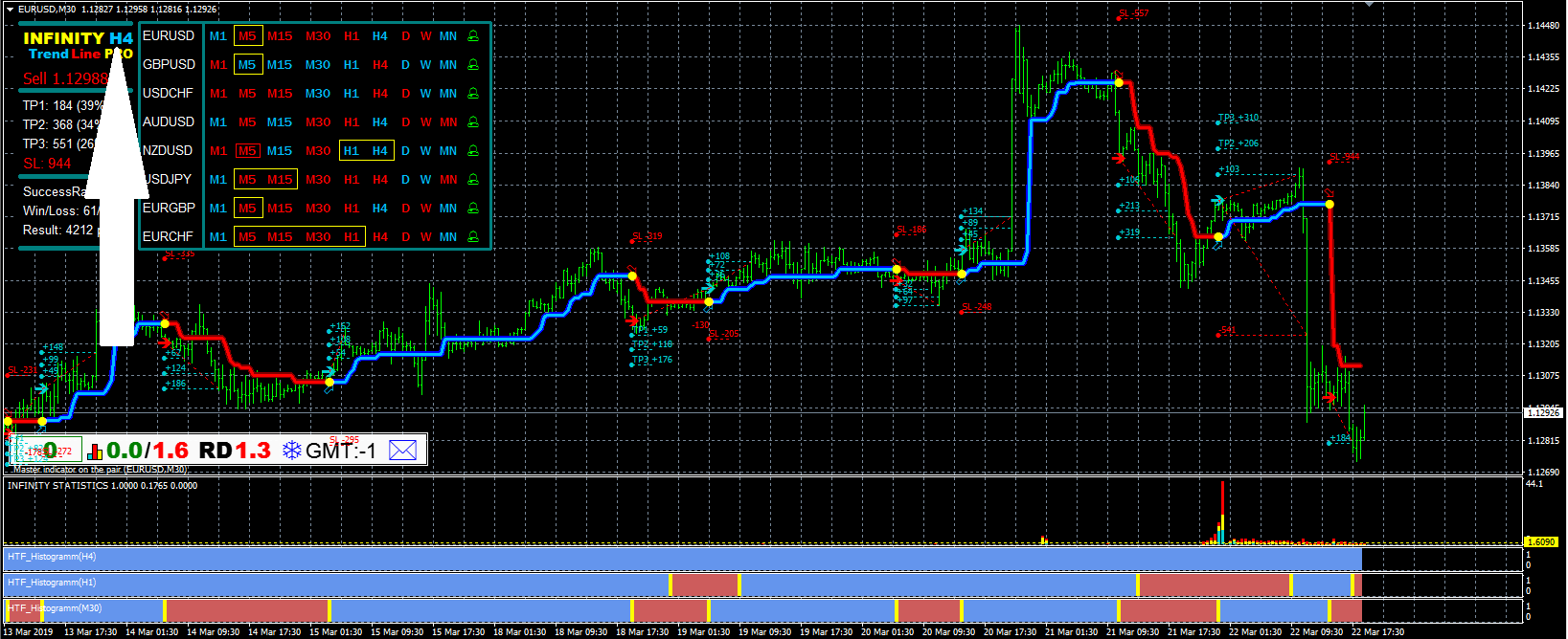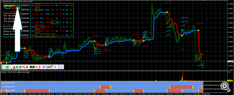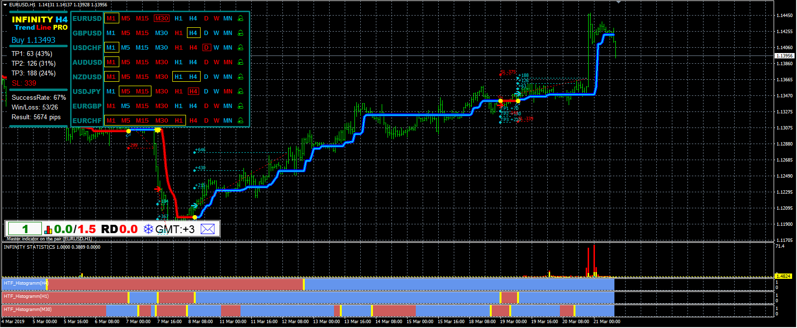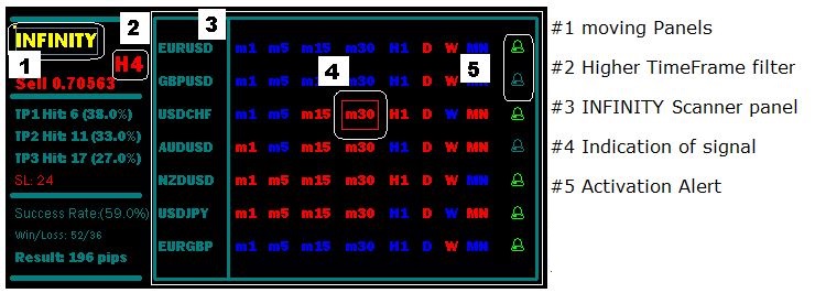 #1 An updated panel is available from version 5.0 of the indicator. Move it around the chart by holding the INFINITYlabel. Double-click to pin or unpin the panel on the chart.