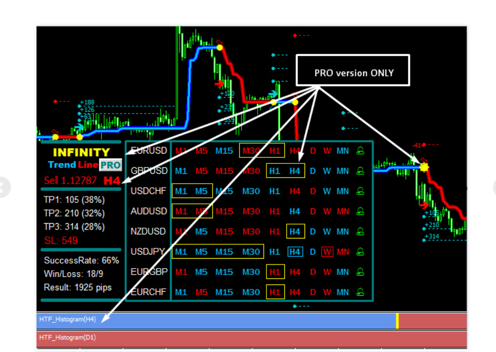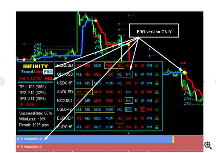 Hi Evgenii, i am new to forex and wasn't doing very well but having bought your Infinity Pro im feeling more confident now. I still dont know how to use it completely and dont seem to have any of the lines on it that show which way a pair is trending, ie the 2 lines with the candles inside. I can see the red and blue lines ok. I also dont have the htf histogram? I wish you could make an in depth video explaining how it all works lol