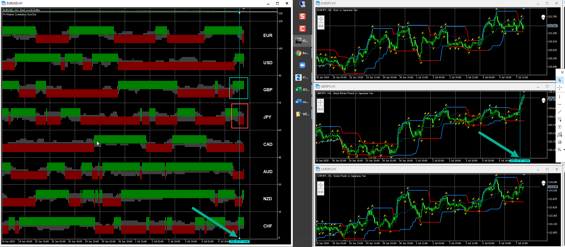 I just wants to help a simple strategy to use this indicator, I look the market at the one hour time frame but i look the the last 24 hours action and also at the 12 hours later otherwise twice a day select the strong versus the weak the I have my own EA Donchian 20 when the candle breaks the external donchian long or short my stop lost is the opposite of band as well the trailing and if you wants to add position as long the Fx Mrket Correlation is with the trend the midline is perfect to trade, I only trade the USD and JPY crosses.