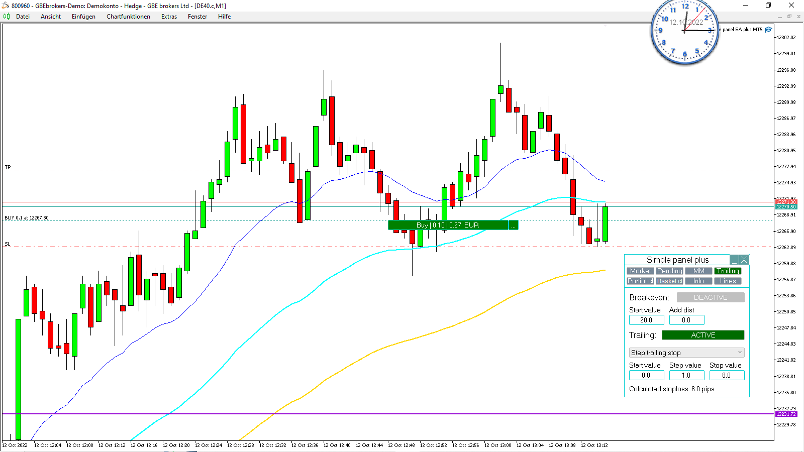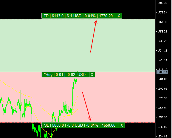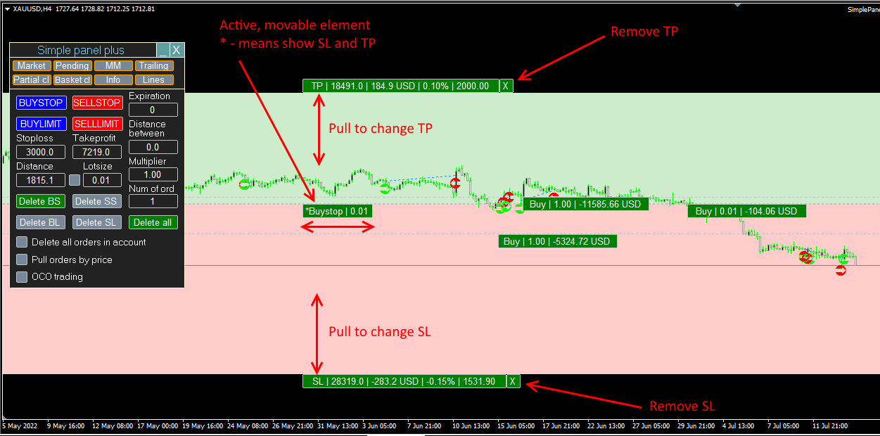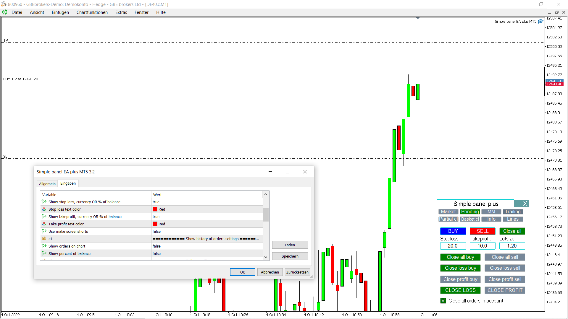 here is a screenshot with a buy order including stop loss and take profit and the corresponding settings of the trade panel.