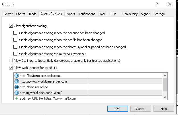 For the EA operation, open "Tools" > "Options" > "Expert Advisors". Check the option "Allow Web Requests for listed URL:". Add https://ec.forexprostools.com and click OK.