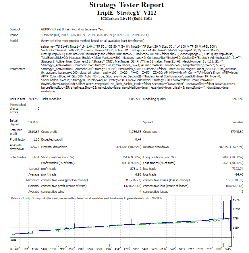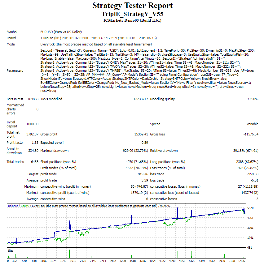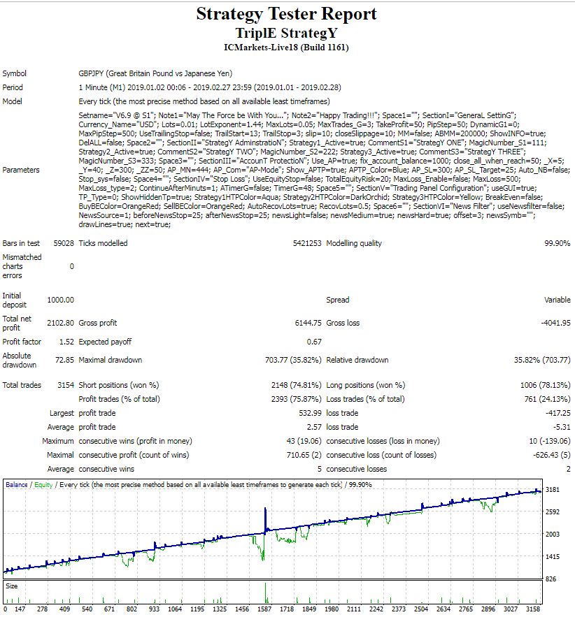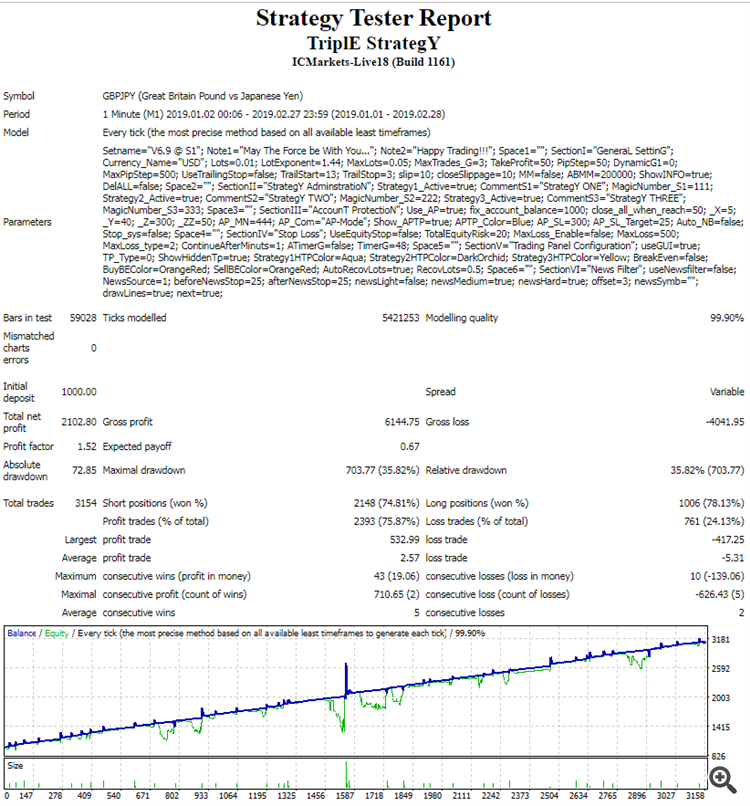 The currencies are EURUSD and GPDUSD, which are tested in the period 2013-2019. Both have better results if StrategY THREE is set to false.