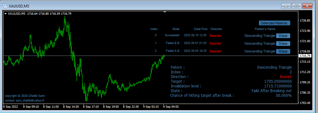 please note that the indicator uses the detected patterns to output the "chance of hitting target after breakout" percentage that appears at the bottom right of the screen, decreasing the number of detected patterns will make this percentage less accurate