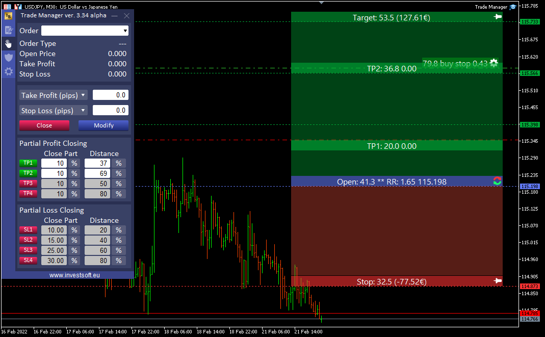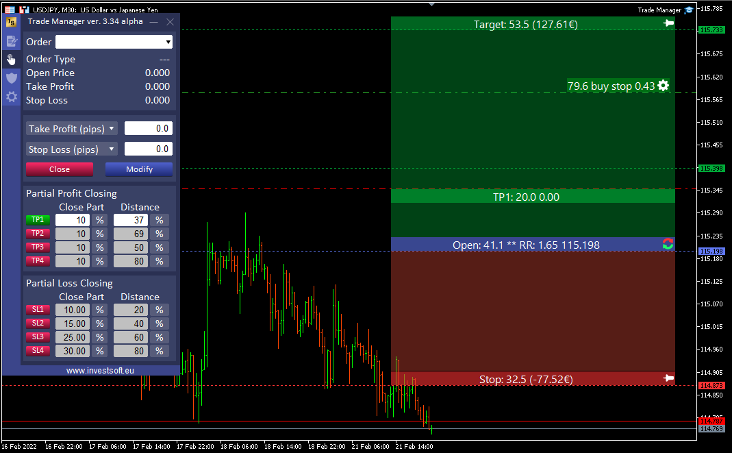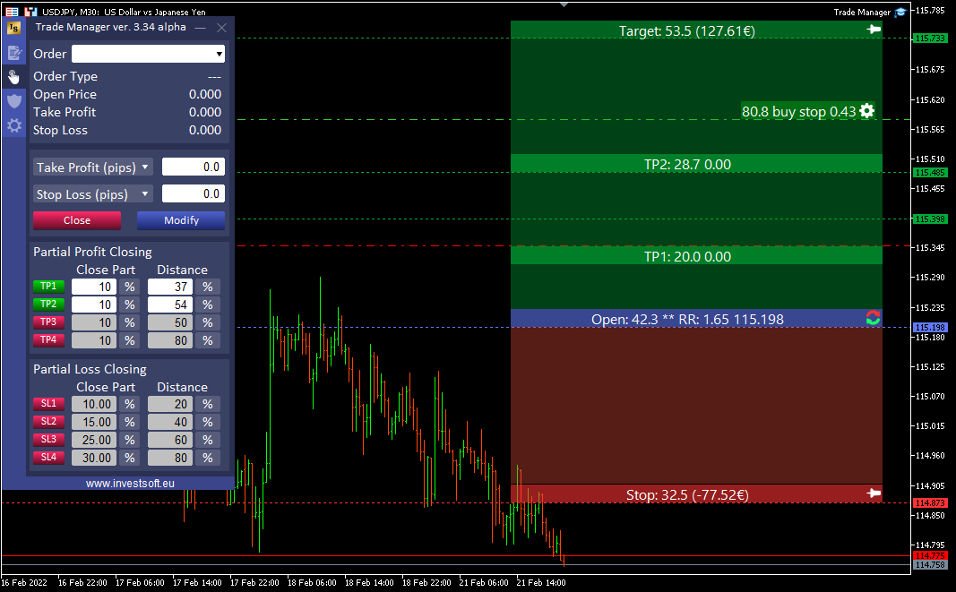 "In this situation, the best solution is to set up a robot to control your trades 24 hours a day. In Trade Manager you have the following functions for managing your positions:"