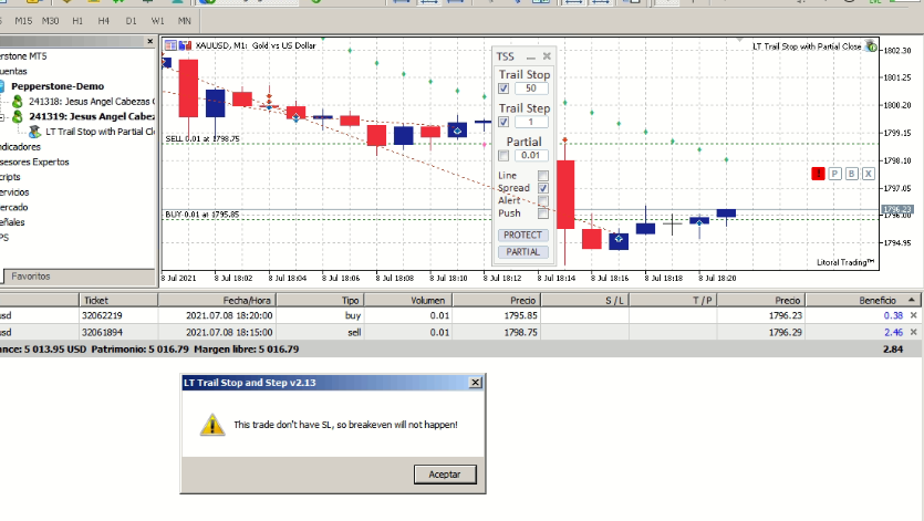 Olá! O EA não tem funcionado direito. Mesmo com a opção de fechar parcial desabilitada, ele tem fechado parcialmente as operações quando bate as configurações do trailing step.