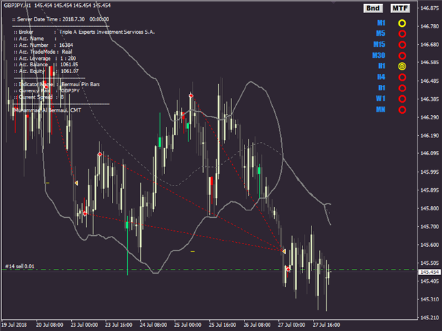 BPB is a unique combination between the famous price action Pin Bars pattern, Bermaui Bands and a Multi Time Frame Candle Direction Panel, but this is not everything.