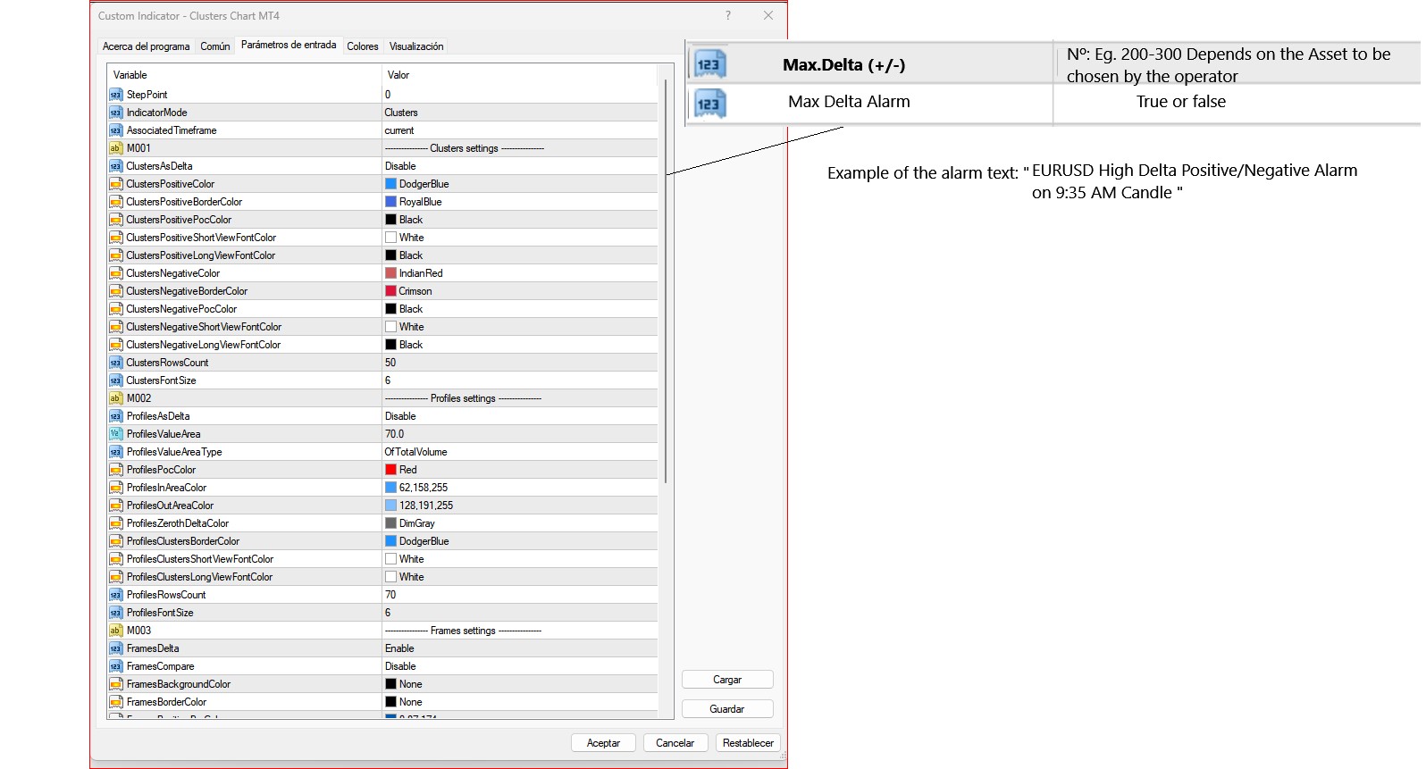 As we well know, the Delta volume indicator shows the relationship between the Ask and the Bid of the participants in the market in an asset. We as operators take the data provided by the tool to reinforce the entry points, at least that's what I do, agreeing with other tools. It would be good for me and I think for other operators Place two inputs. The first would be an empty space to place within it the reference number to which, if the delta peak reached it, it would send an alarm to the screen or to the mobile informing us of the situation. it is important as long as the tool waits for the close of the candle to be correct. And the second input would be a true or false space if we want the alarm to work or not.