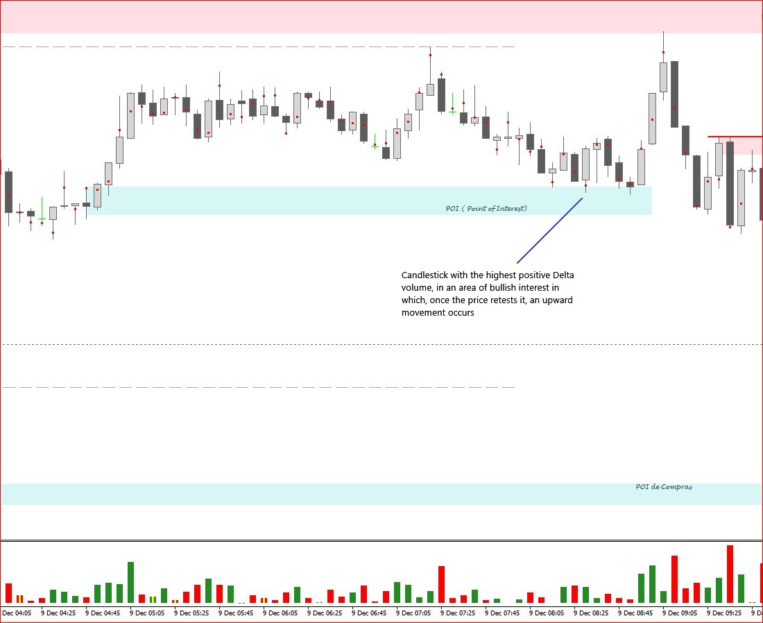 Yes Sure,,, it would be the candle where the volume peak occurs... at the end of said candle is that the alarm would appear.... The movement that occurs after is just a diagram of the price movement, the reaction that the market has when returning to the area where the movement originated with that delta and to see the result. If the Delta peak occurs in the 9:00 am candle, for example, at the end of that candle in a M5 TF, the alarm could be sent... then it is the operator's responsibility to pay attention to it or not. and act accordingly