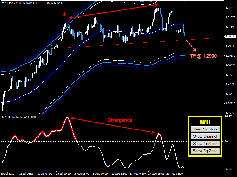 The divergence between the MASR Stochastic and the GBPUSD price candles shows weakness in the current trend momentum, which might lead to a downward movement that might target 1.2900 $
