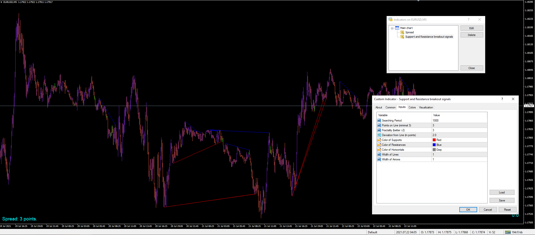 If you have 5 digits after point in EurUsd, try to use "Deviation from Line" = 10.
