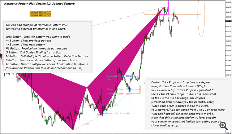In version 9.2, Custom Take Profit and Stop Loss are defined using Pattern Completion Interval (PCI) for more claver setup. 3 Take Profit is equivalent to the 3 x the PCI box range. 1 Stop Loss is equivalent to the 1 x the PCI box range. The ellipses (stretched circle) shows you the potential entry. When your order is placed inside this circle,
