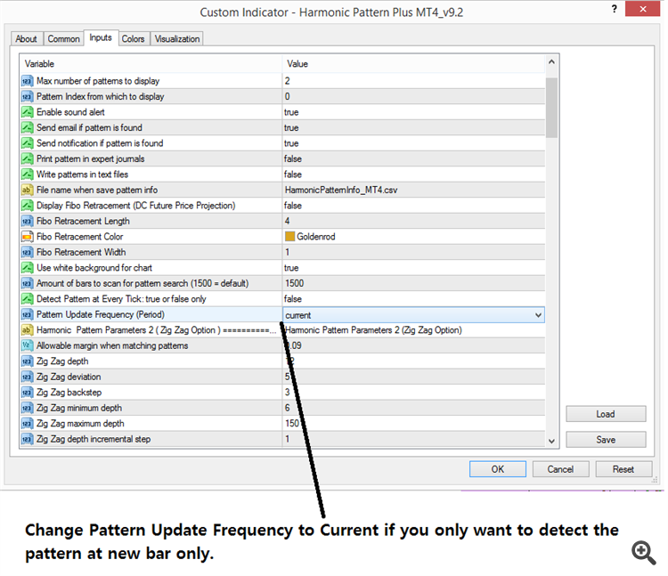 Note that if you detect pattern more frequently, of course, this will increase your computational burden for Harmonic Pattern Plus. So use the sensible frequency only. In our experience, M1 or M5 might be good choice. If you try to detect patterns at every single tick arrival, this might cause serious computation overload in your computer.