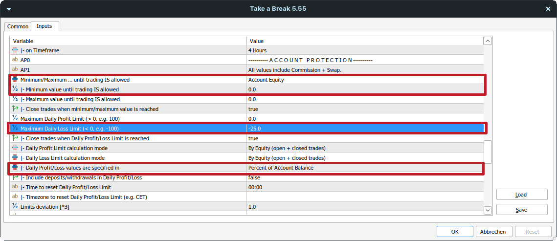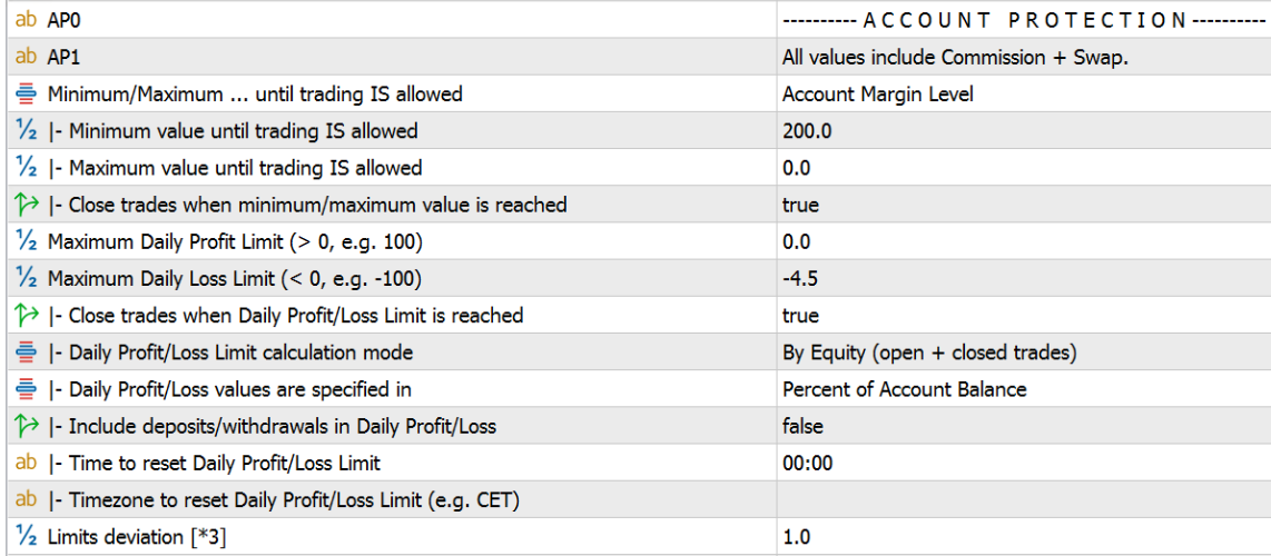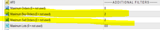 Ces entrées limitent le nombre maximum de transactions ouvertes. Vos paramètres signifiant que TaB suspendra le trading dès qu'il y aura 2 ordres d'achat et/ou 2 ordres de vente. Vous devrez ensuite les fermer manuellement, ou attendre qu'ils dépassent leur objectif de profit. Soit via un TP/SL dur, soit vous pouvez également configurer la section "Drawdown Control" de TaB en conséquence, afin qu'il clôture toutes les transactions sur un certain profit/perte.