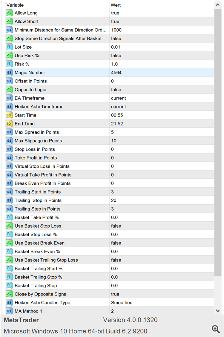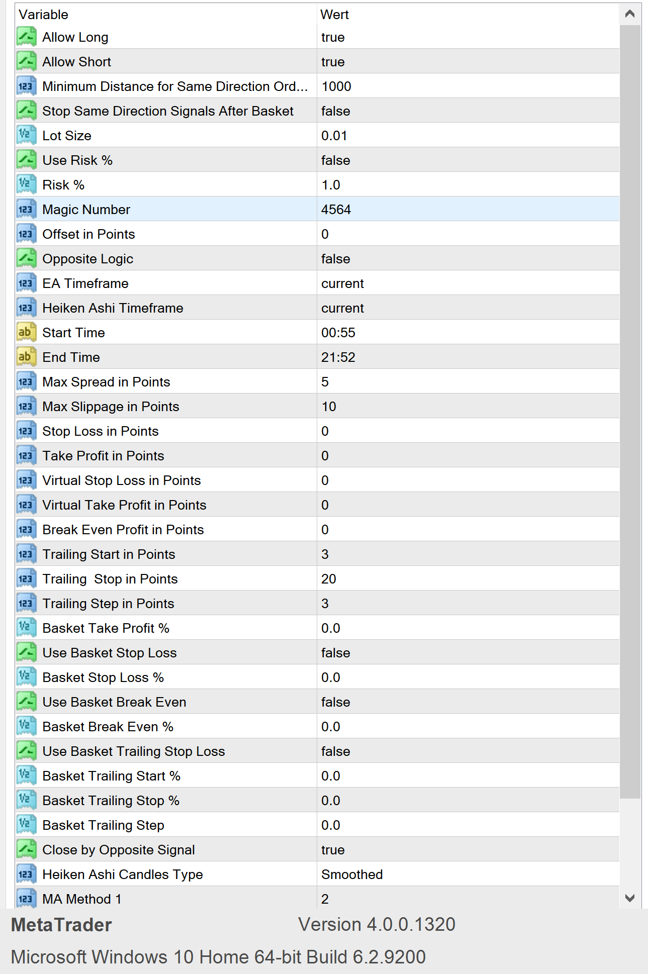WARNING: You must adjust Heiken Ashi EA's MT4 Start Time and End Time settings accordingly, before you test or trade with it!