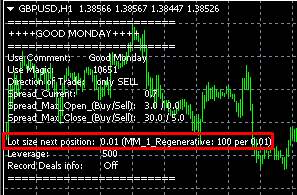 "MM_Reg" is MM, but the trading lot will not decrease when there are drawdowns ( and funds are withdrawn from the balance)⚠️. If you want the lot size to be recalculated (for example, when withdrawing part of the funds from the account), then change the lot value for "MM_Reg" or attach the EA to the chart again or restart the terminal.