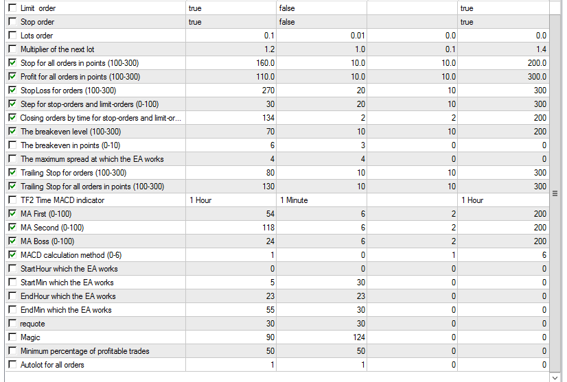By default, the recommended settings for the EURUSD pair for the hourly chart are set. The time is set for GSM+2 operation.