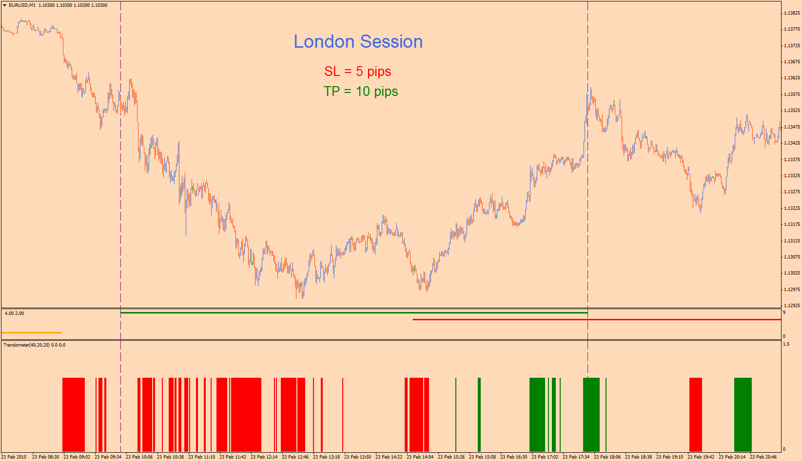 1. Attach the indicator to a M1 or M5 chart with the default settings.