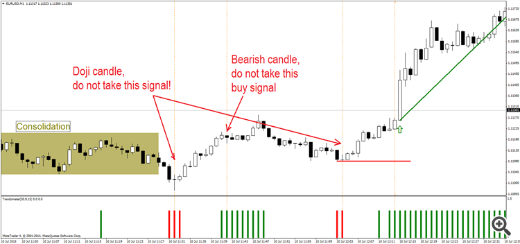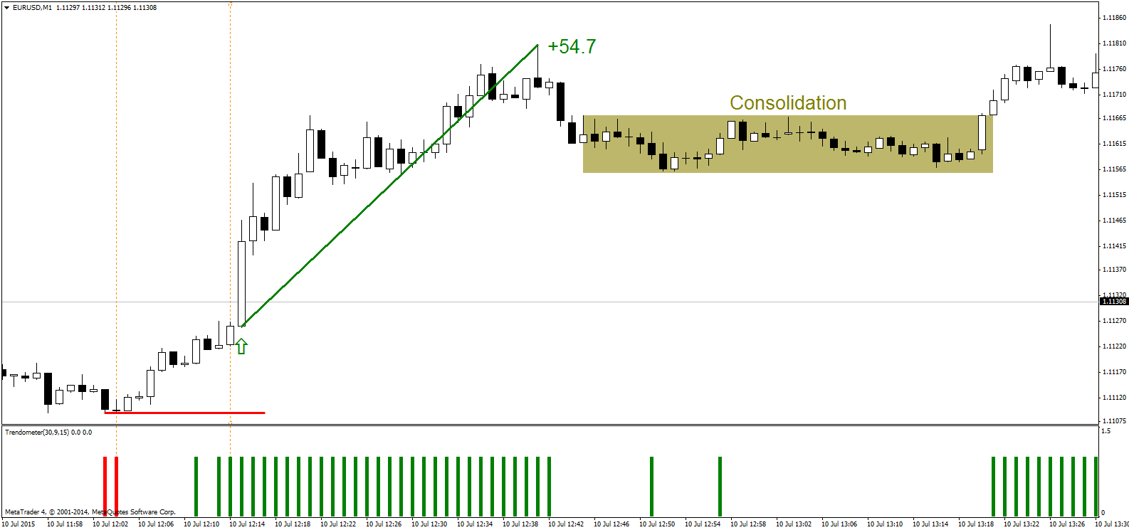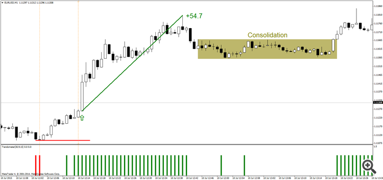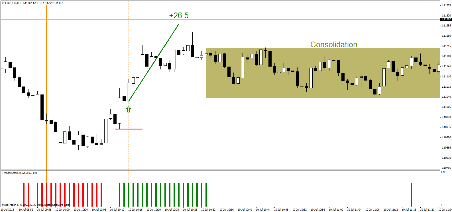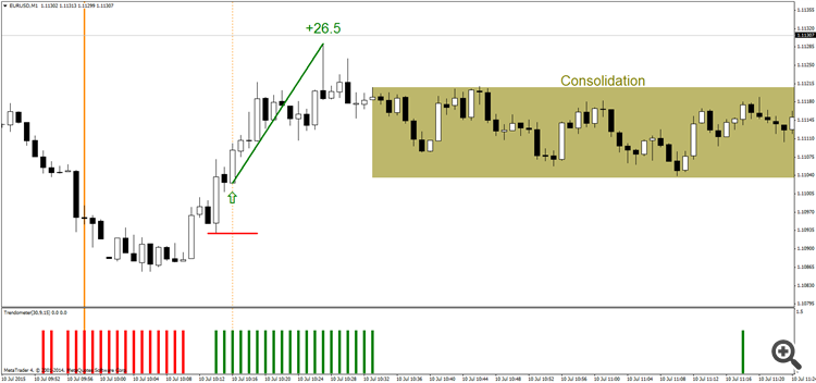 First signal (please note that the maximum possible profit is labeled on the following charts, the target is 10-15 pips only!)