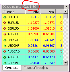 3. Сравните время в терминале МТ4 (см. скрин) со временем UTC. В данном примере время сервера брокера: 02:11:30, время UTC: 00:11:30, значит в настройках ServerBroker (UTC) = 2.