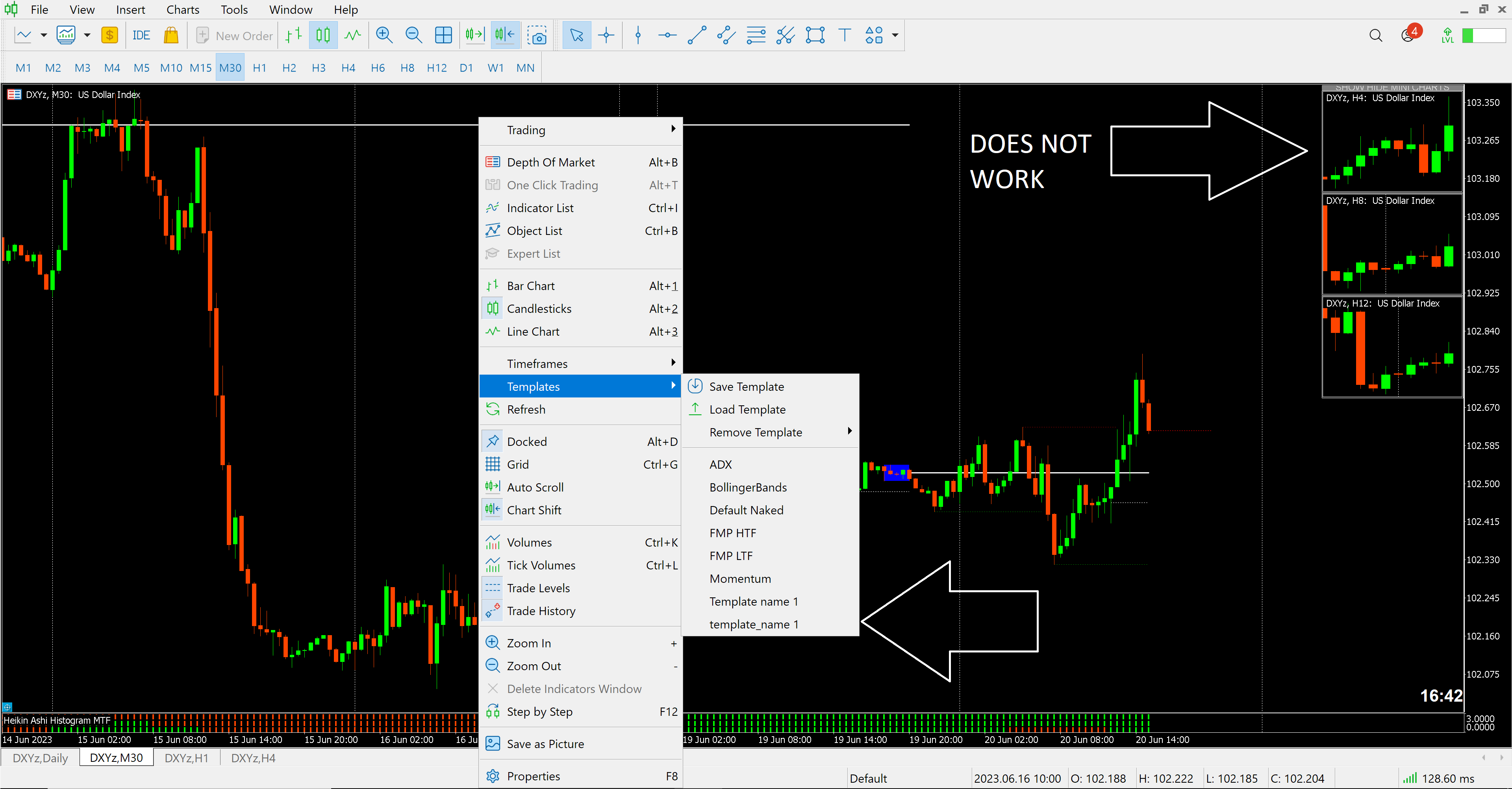 I followed the instructions to load different templates on the mini charts and it does not work. All I wanted was to see heikin ashi of different timeframes. I opened a new chart and created the template there. It was only the heikin ashi indicator and nothing else. I saved the template as Template name 1.
