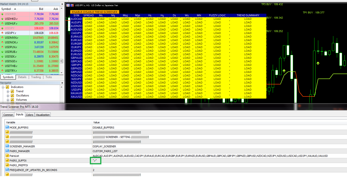 the broker applies a 0 spread (or 0,1-0,2) but calculates a commission. The amount of the commission is close to the size of the spreadMy broker uses the suffix ".r" for raw ccy pairs. However, the indicator does not load them when the suffix is entered into the input field. I've entered the suffix correctly as you've mentioned in one of the other comments. Looks like there is an issue with the indicator which needs rectifying. Please check my settings to confirm. Thanks.