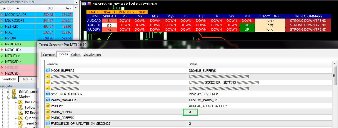 My broker uses the suffix ".r" for raw ccy pairs. However, the indicator does not load them when the suffix is entered into the input field. I've entered the suffix correctly as you've mentioned in one of the other comments. Looks like there is an issue with the indicator which needs rectifying. Please check my settings to confirm. Thanks.