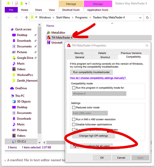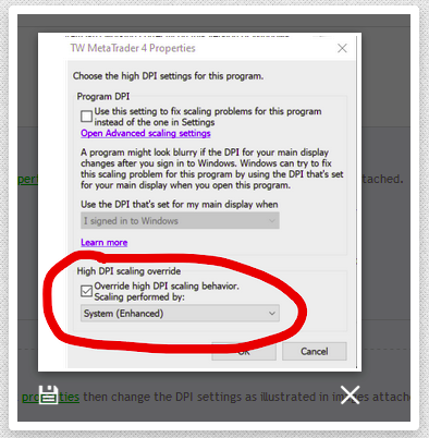1> Right click on MT4 icon and select properties then change the DPI settings as illustrated in images attached.