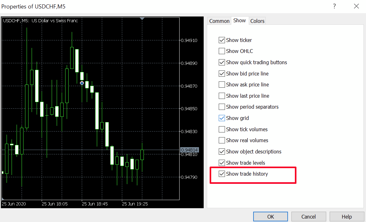 Under MT Chart Properties, Just remove the tick under "Show Trade History"