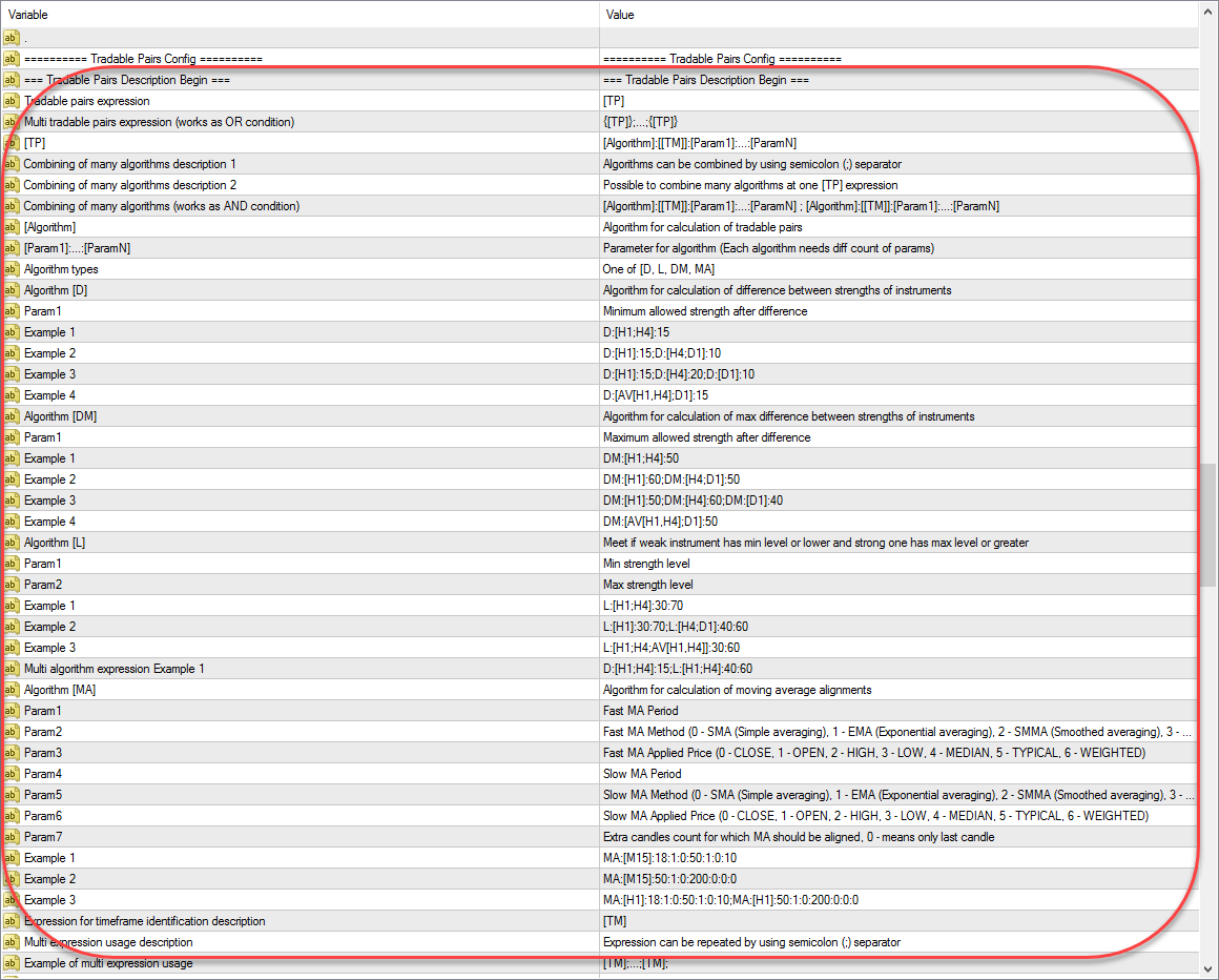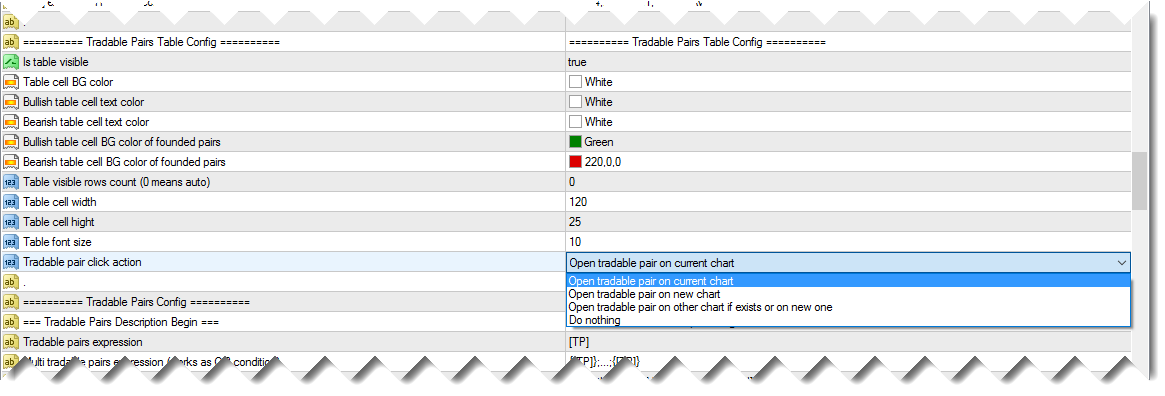This expression is applied to all pairs one by one. Once all conditions from tradable pair expression is satisfied this pair is added to tradable pairs table. It's possible to have several tradable pairs columns with different expressions. It allows to have tradable pairs for different strategies. To have many tradable pairs columns with different expressions you should write each expression at separated brackets '{}'.