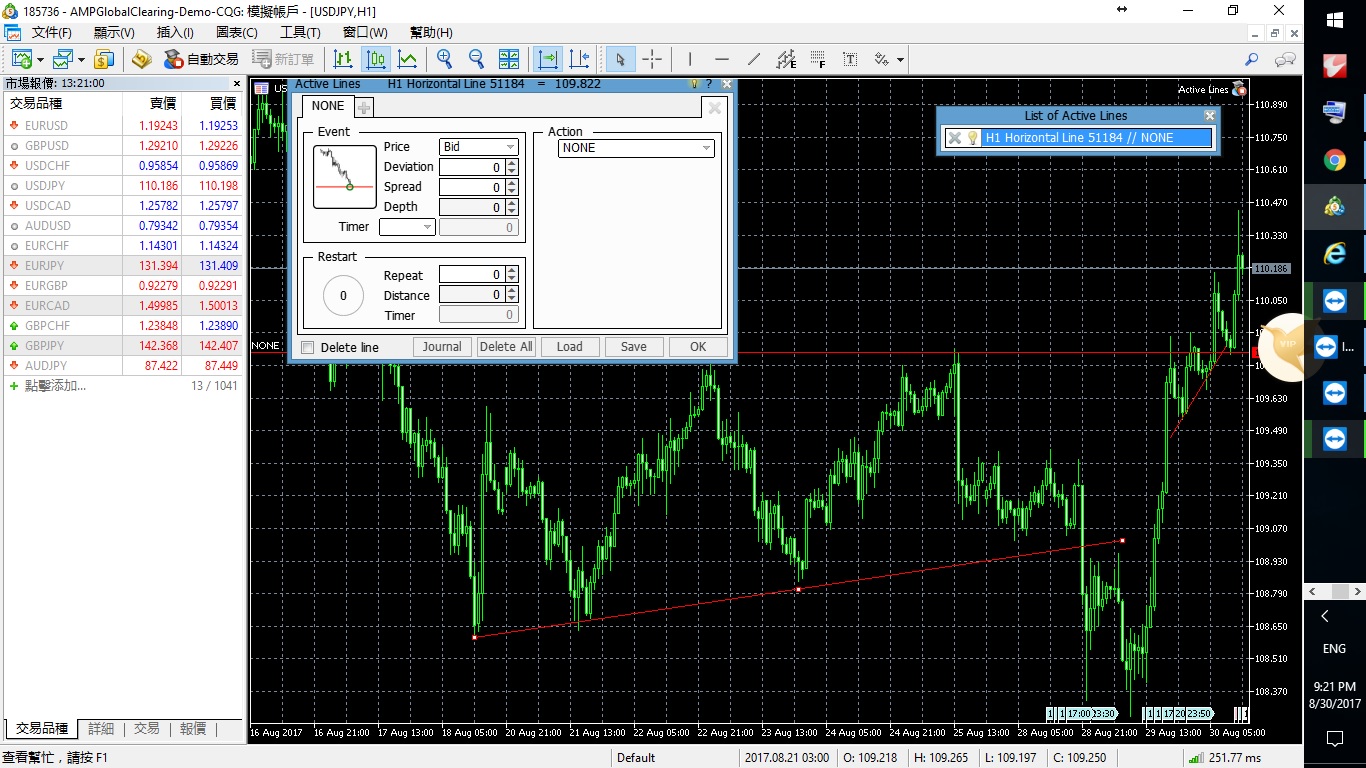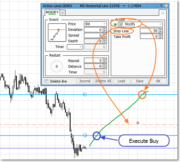 The part Restart seems to be of interest when I want to place a grid of orders. I would expect to choose the values Repeat=5 and Distance=50 for placing 5 additional implicit lines which are parallel to the one I am working on. The first one will be 50 ticks above the line I had drawn and each of the other four of them is 50 ticks above the previous one. However, when trying the option Active Lines seemed to behave in a different way.