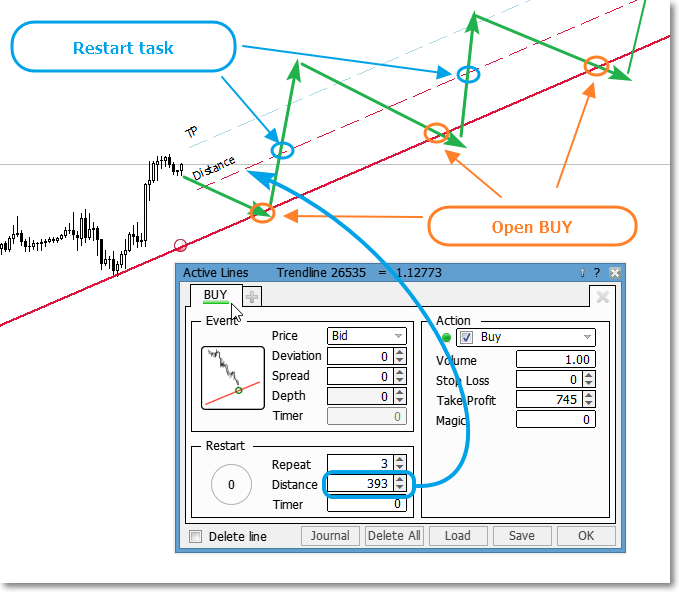 Большое спасибо, so I can only use the edit field Price in "Action" in order to have lines parallel to the one I edit which I wish to use for placing stop orders when the price reaches the line I edit. After all the help tells me "Price of pending order ... is specified in points" and the edit field Distance in "Restart" just lets me specify by entering 10*x that after executing a Buy Stop at 1.00000 a Buy Stop will not again be executed at 1.00000 as long as the price only fluctuates between 0.999y0 and 1.000x0 provided y=10-x. Am I right?